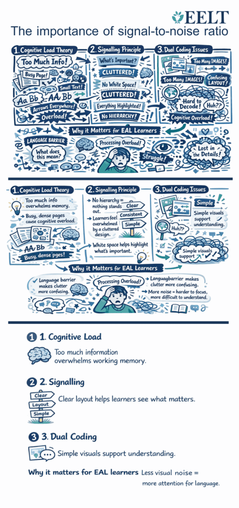 This already requires significant cognitive effort. If the visual design of materials is dense or confusing, it adds extraneous cognitive load, effort that does not contribute to learning. Instead of supporting language development, the learner’s attention is divided between: